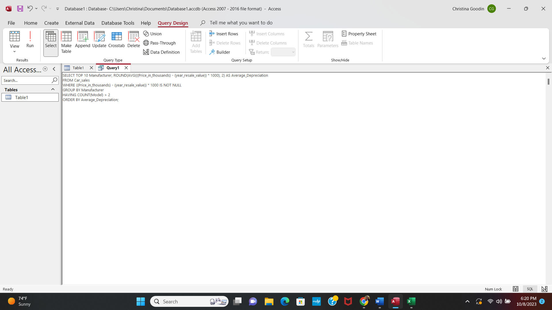 For whatever reason, the double underscore before “year_resale_value” was messing up my query, so I had to take out the double underscore in the column name to get my query to run. Anyone else have that issue?