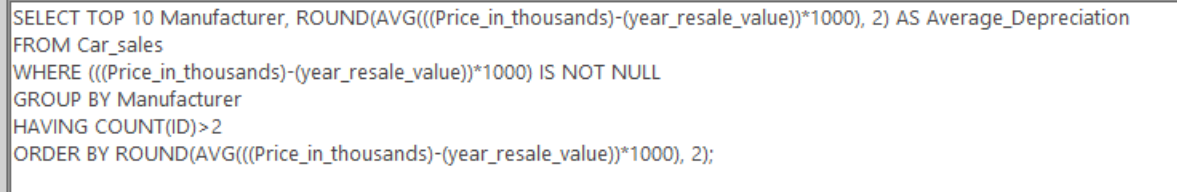 SELECT TOP 10 Manufacturer, AVG(((Price_in_thousands)-(year_resale_value))*1000) AS Average_Depreciation