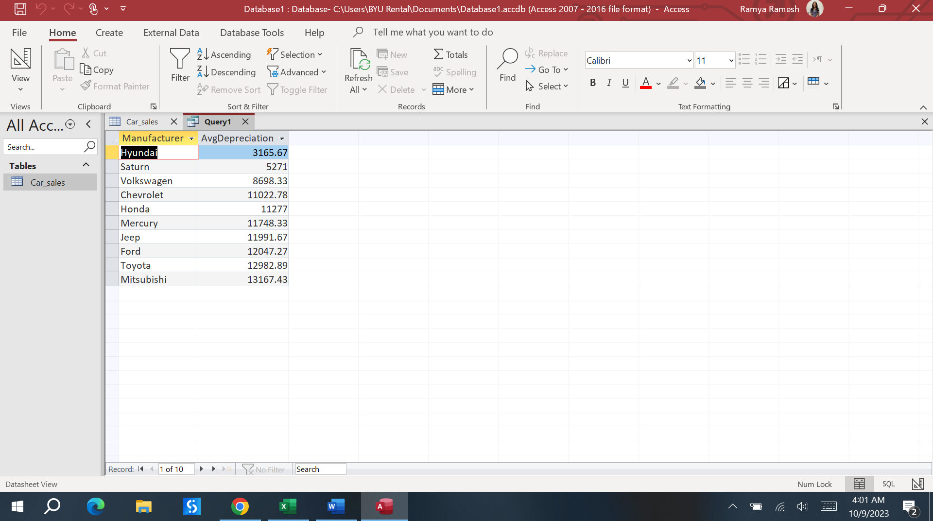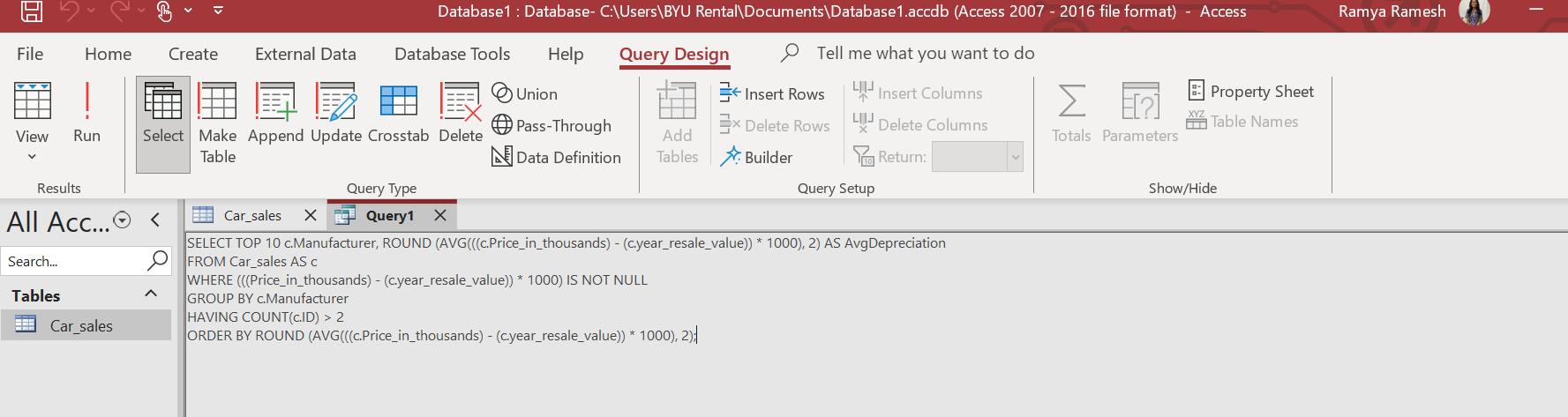 However, my query would not go through. It kept asking for a parameter for year_resale_value, and I could not find my way around that.