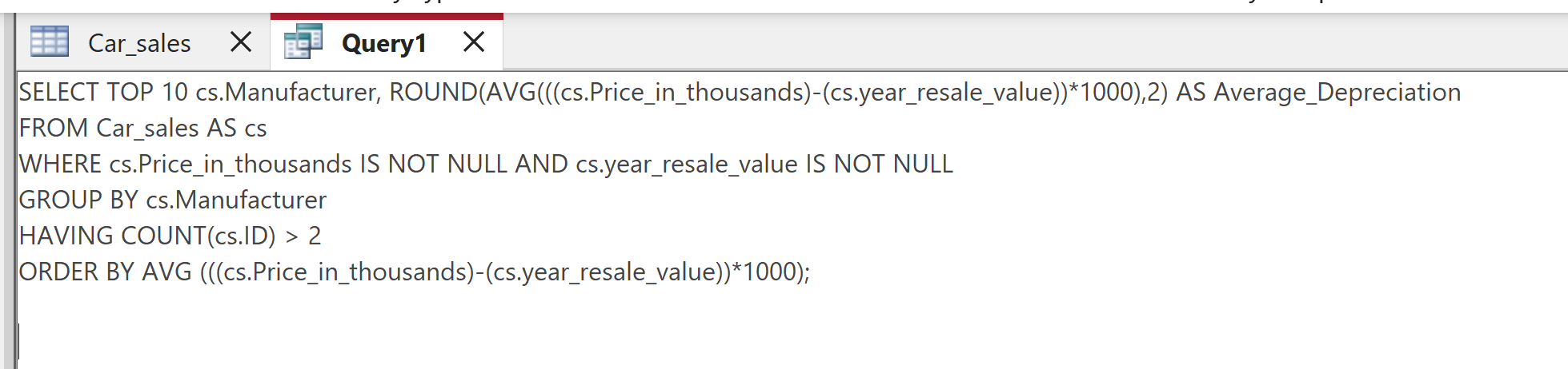 SELECT TOP 10 Manufacturer, ROUND(AVG(((car.Price_in_thousands) - (car.year_resale_value))* 1000), 2) AS Average_Depreciation