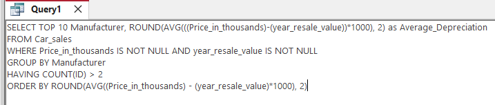 SELECT TOP 10 Manufacturer, ROUND(AVG((Price in thousands)-(year_resale_value))*1000), 2) AS AverageDepreciation