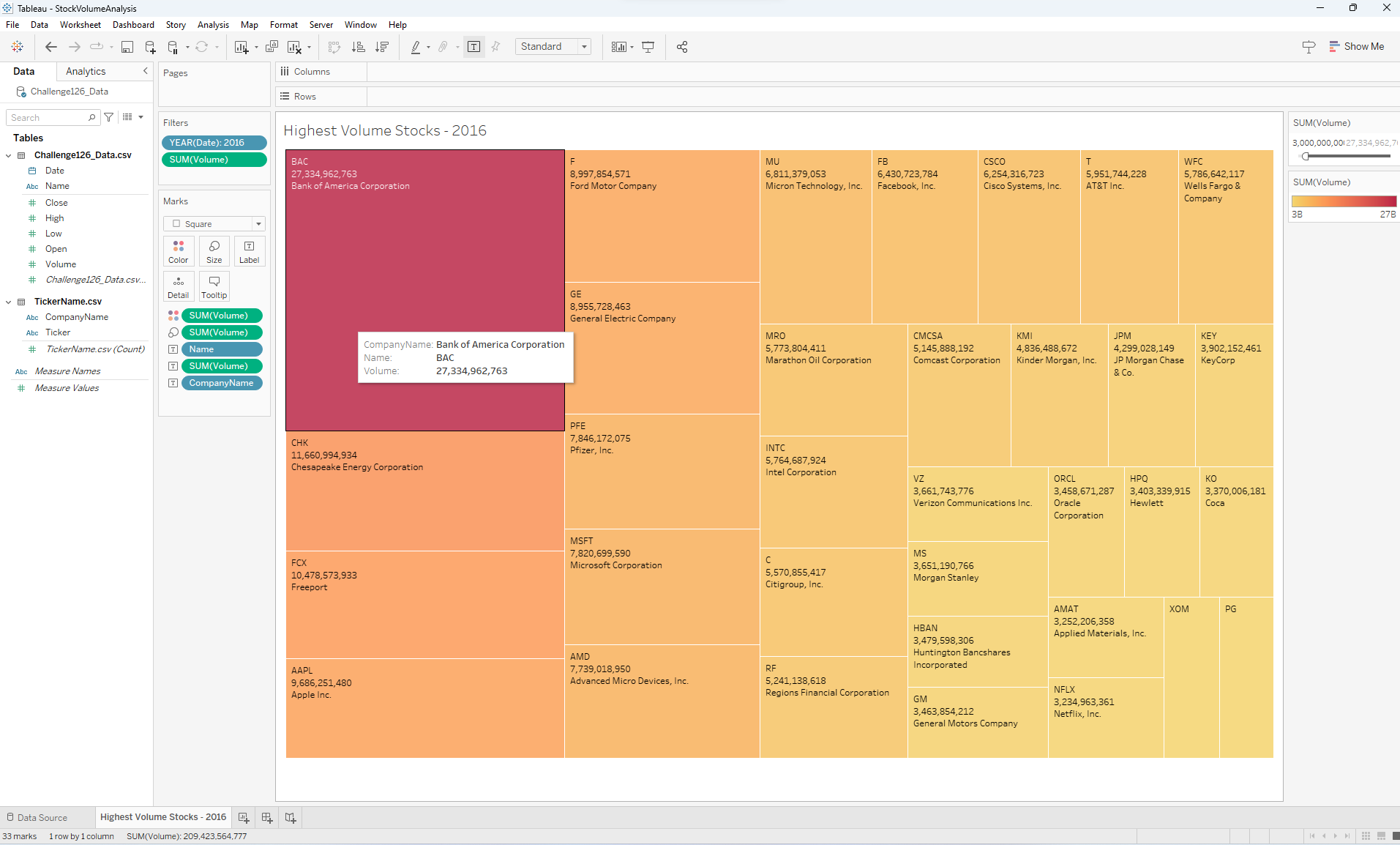 You have just started an internship as a stockbroker at your dream company. The pressure is on to learn quickly and provide value so you can secure a full-time offer at the end of the summer. You’ve just finished orientation and your new manager has asked you to spend the rest of the day getting familiar with some of the tools you’ll be using over the next couple of months. She told you that she’d be impressed if you could create a chart in Tableau showing the companies with the highest total trading volume in 2016. She says you can format this chart however you’d like as long as it’s easy to understand. As one final note, your manager mentions that using packed bubbles might be appropriate for the dataset.