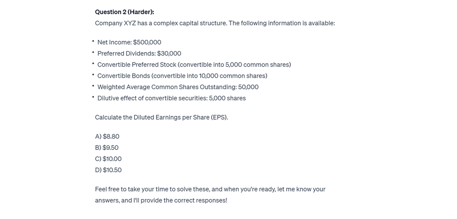 Prompt 3: Come up with a prompt or series of prompts to generate 2 practice questions for Earnings Per Share Calculations (one of the subtopics listed under “1. Conceptual Framework and Financial Reporting”).