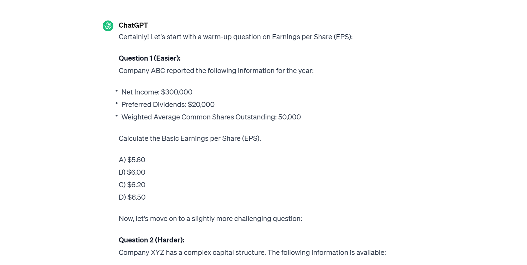 Example prompt: Ok I’m a little rusty on the earnings per share calculations. Can you give me 2 practice calculations that would look similar to what I could see on the CPA exam? Can you make the first one a little easier as a warm-up and the 2nd one harder? Also, can you give me answer choices for each question like they would on the exam, but don’t tell which one is correct until I respond?