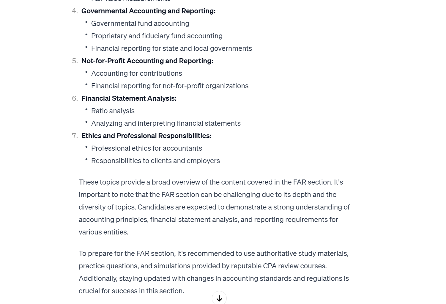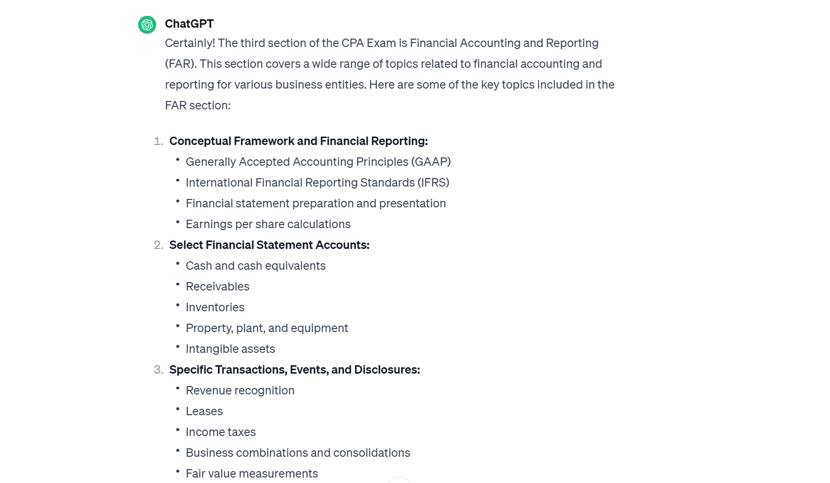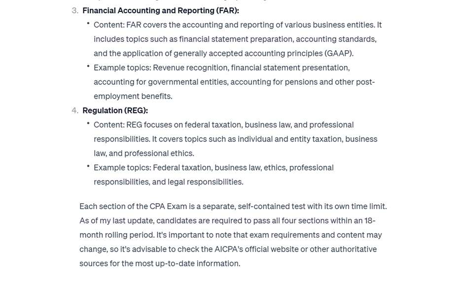 Example Prompt: I don’t understand the section on Financial Accounting and Reporting as well as I should, do you know what topics would be included in that section?