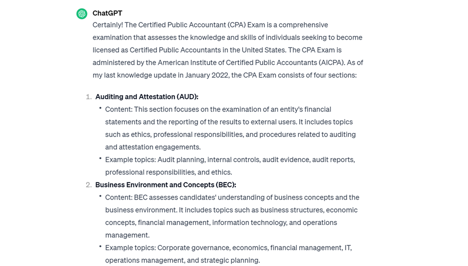 You are finishing up your accounting degree and getting ready for the big CPA test. You are nervous and want to study in the most efficient way possible. You decide involving ChatGPT couldn’t hurt your chances so you decide to ask for its help. You know the best way to get good responses is to be specific and you decide to test it out on every stage. Follow the instructions below to get some study help! (The principals practiced here can be used for every standardized test: CMA, MCAT, GMAT, ACT, SAT, etc)