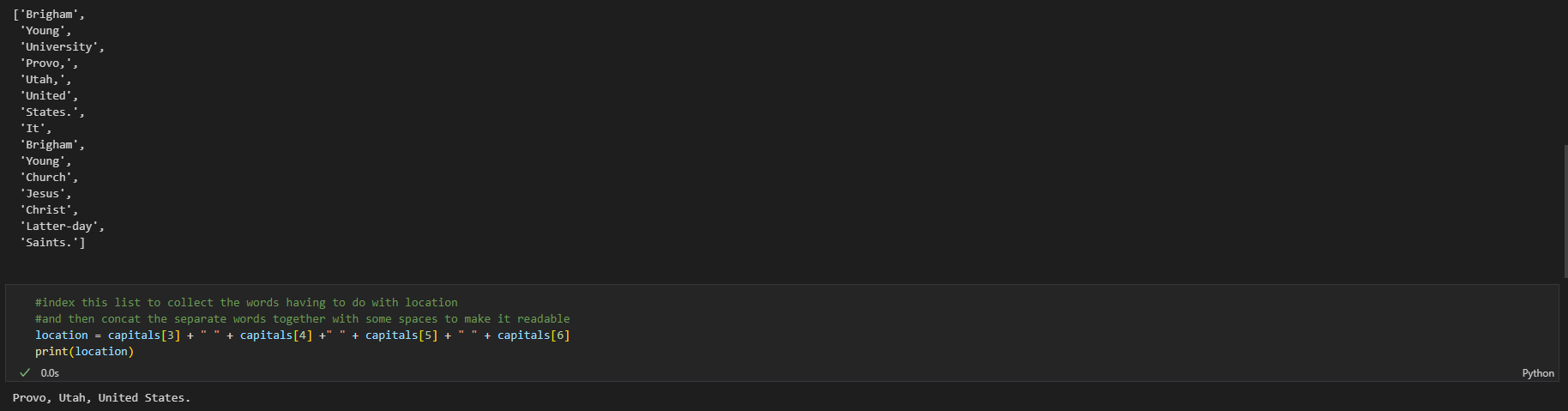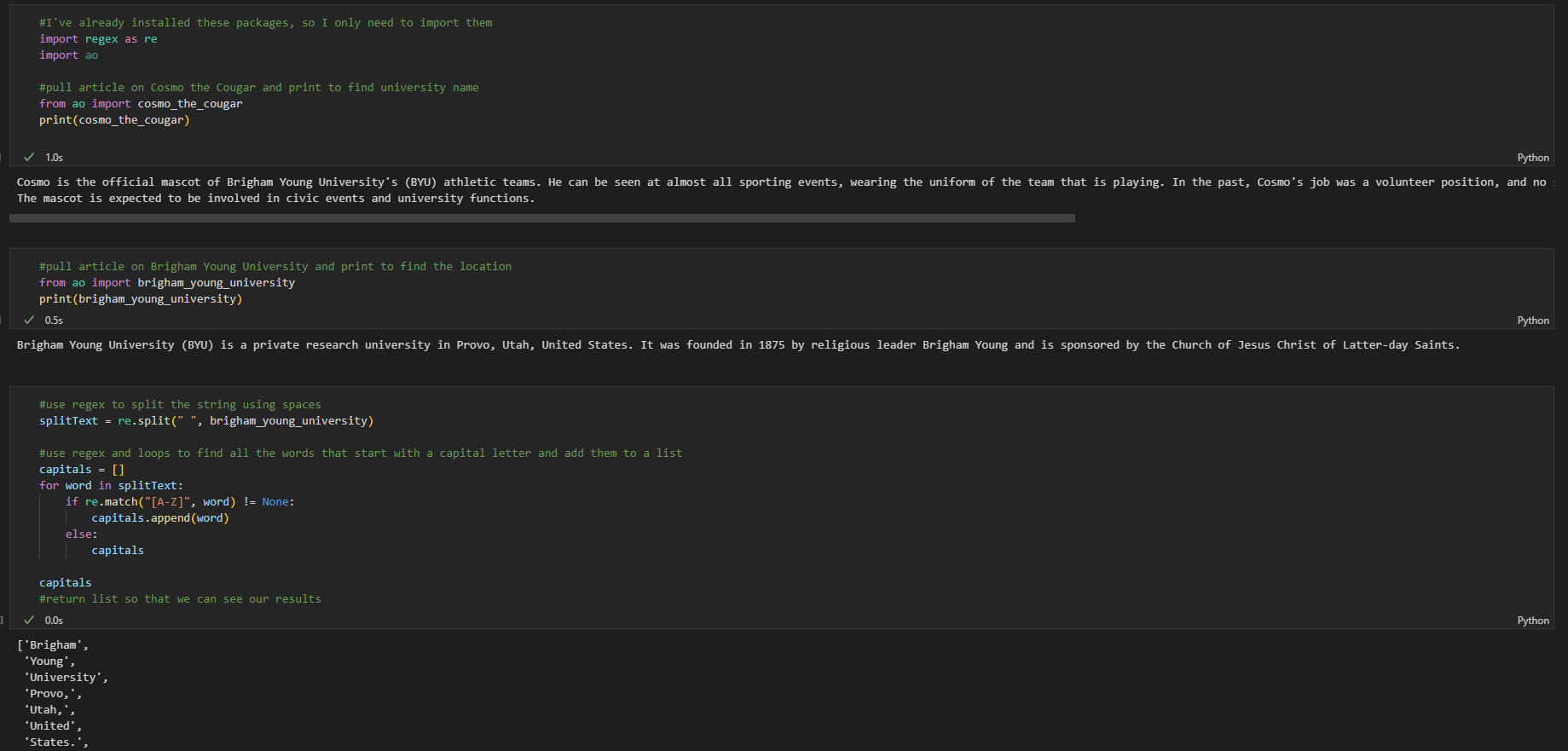 - Using RegEx (and any other tools you’ve learned so far), create a string variable containing the location of Cosmo’s university.