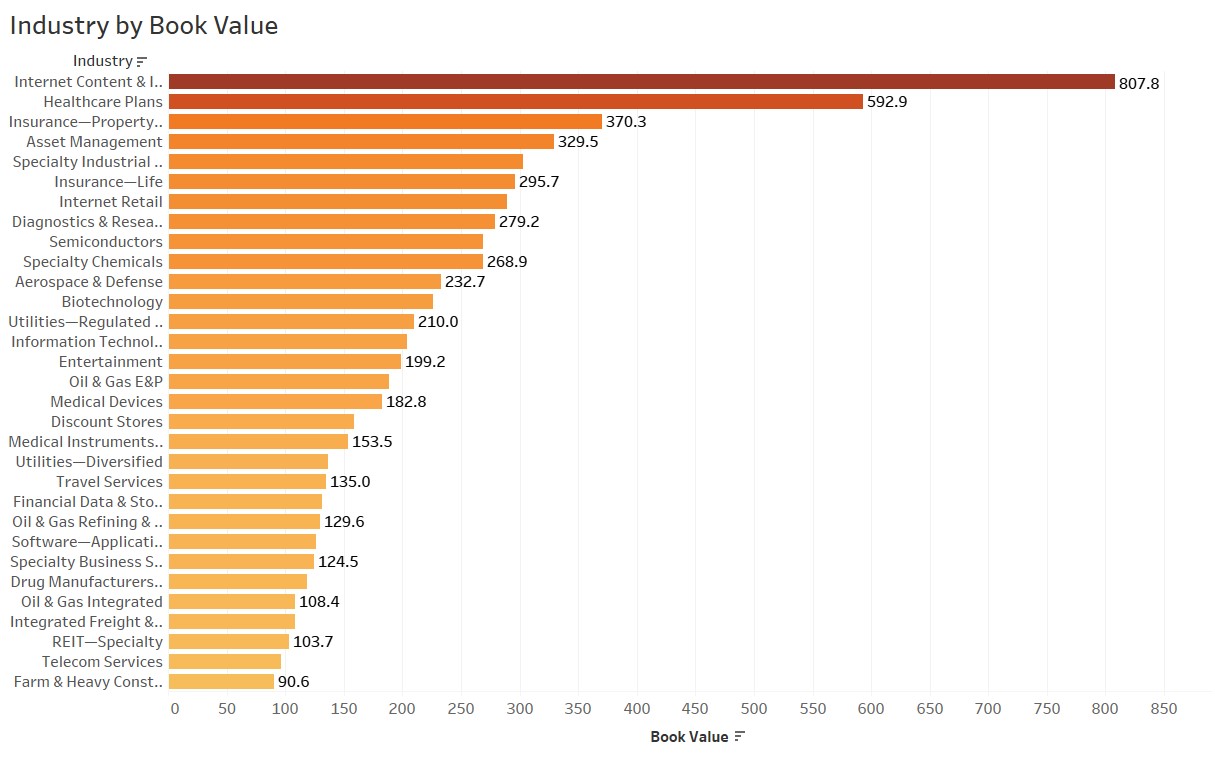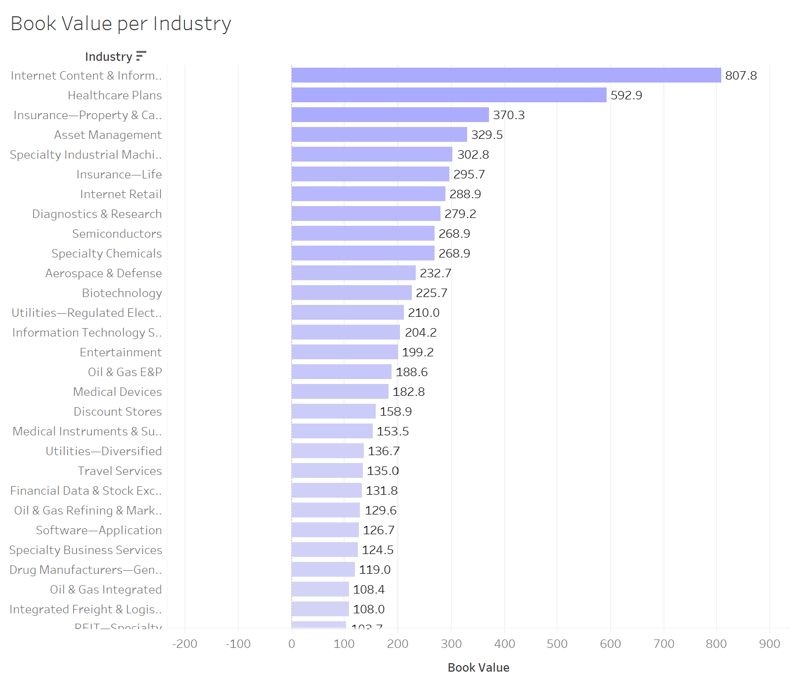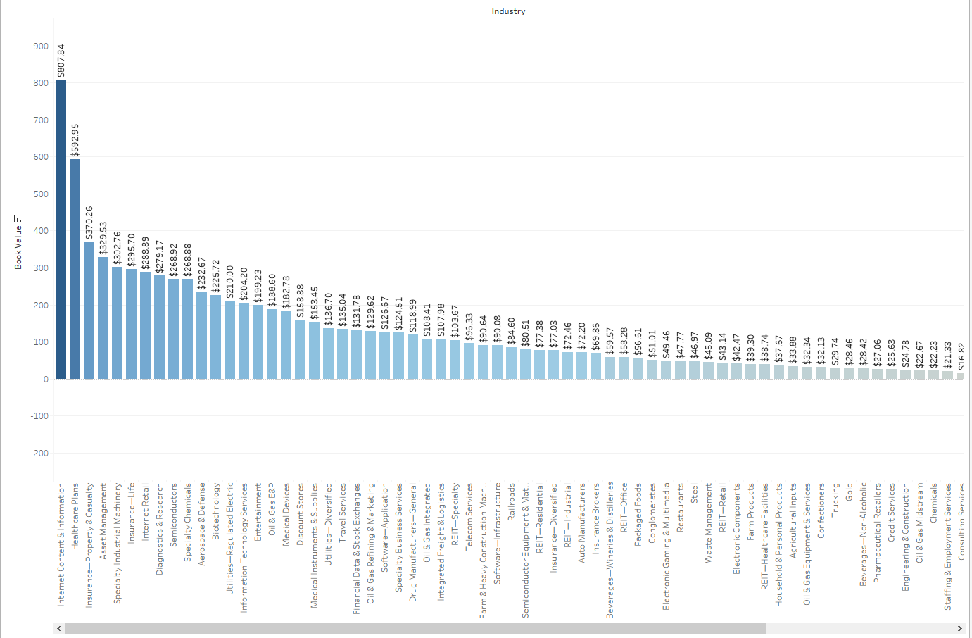 To make things look a bit cleaner, I filtered out any industries with a book value of less than 0. This eliminated the white space between most of the industry names and the bars!