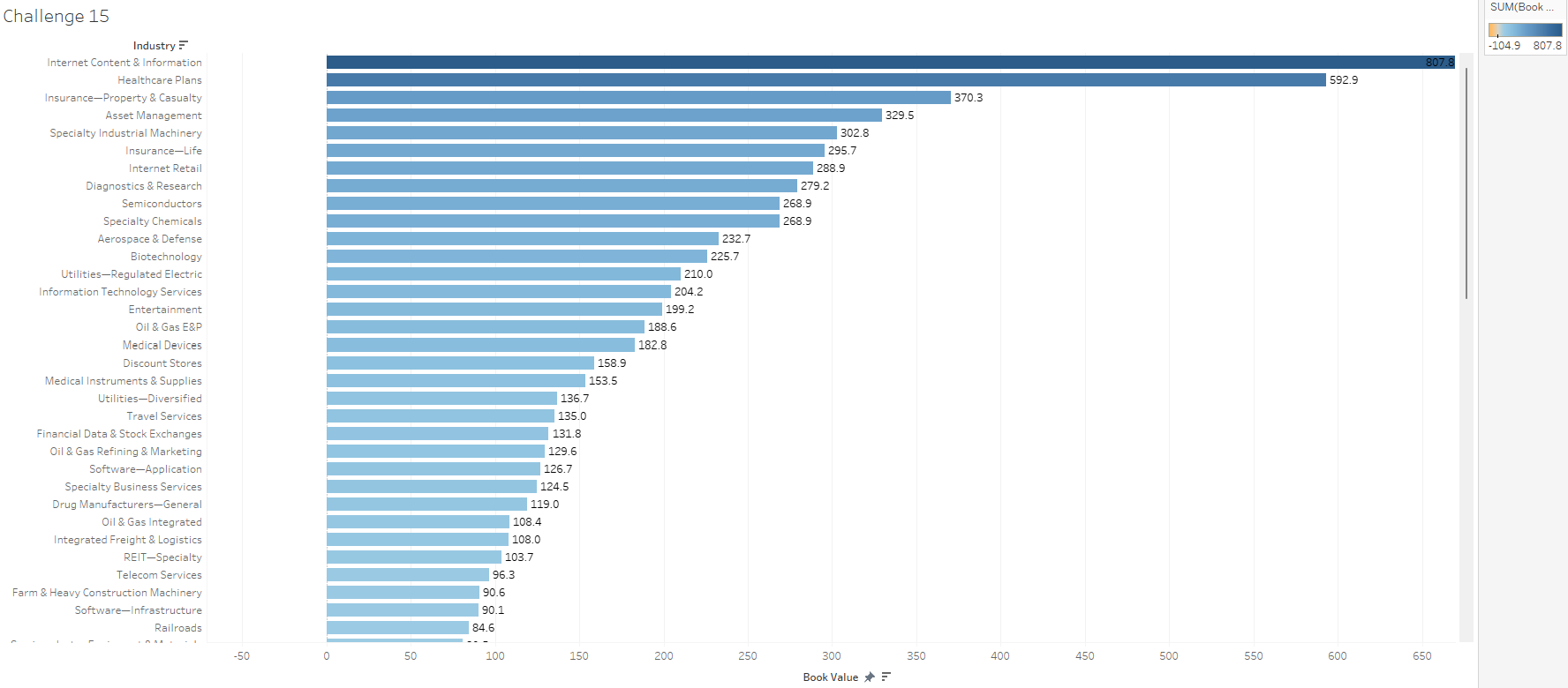 Such a great challenge and a nice way to use my tableau skills! I am a little surprised that internet content and information are at the top for book value. I would have thought the value of those companies came from unquantifiable assets like goodwill and brand image. But it seems that they have a very high book value.