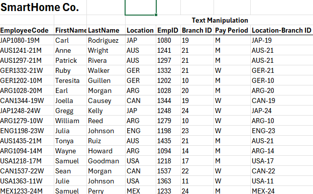 SmartHome Co. sells smart home appliances including doorbells, CCTVs, smart light bulbs, home security products, etc. SmartHome has an international salesforce and generates millions of sales each year. You are given the dataset of SmartHome employees including their information, performance, and satisfaction scores. In this challenge, you will be using text manipulation functions in Excel to uncover interesting facts about Smart Home and its employees.