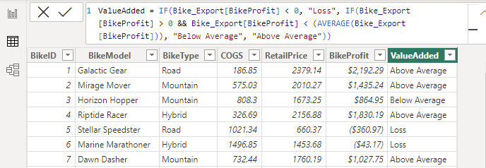 - A column (ValueAdded) that gives a descriptive analysis of the profitability column, in order to make it easier to interpret and gain insights from the data. This column should return one of three values (“Loss,” “Below Average,” or “Above Average”) based on the profitability of the bike (below zero, below the average BikeProfit, above the average BikeProfit, respectively).