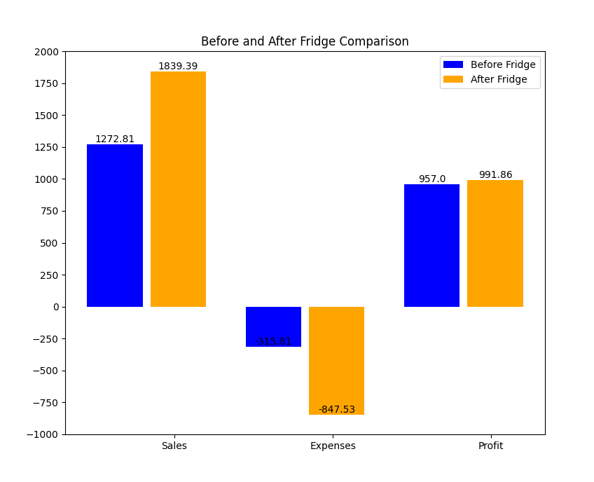 - Total Sales for both periods (Before/After the purchase of the mini fridge)