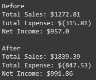print(f'\nAfter\nTotal Sales: ${round(total_sales_after,2)}')