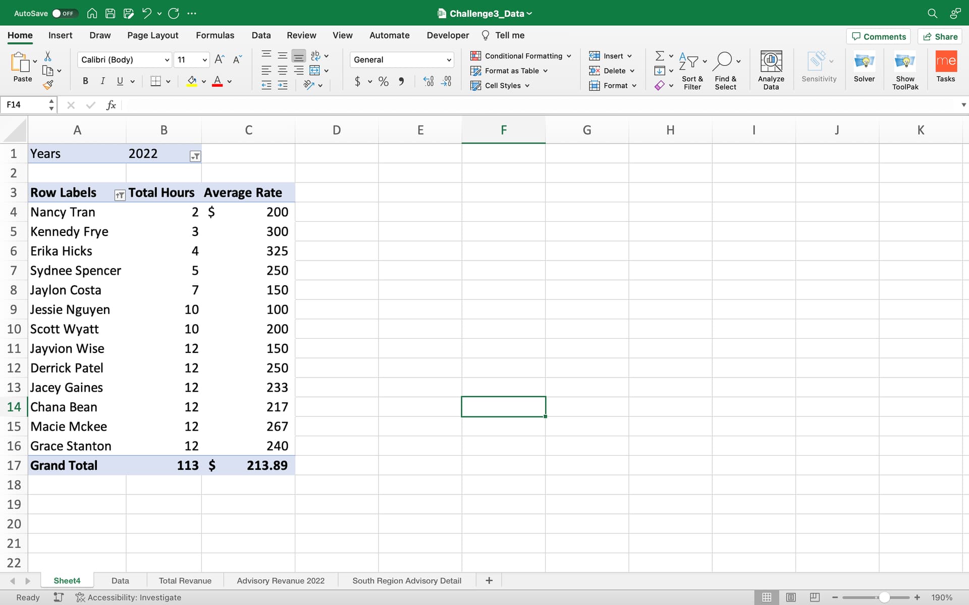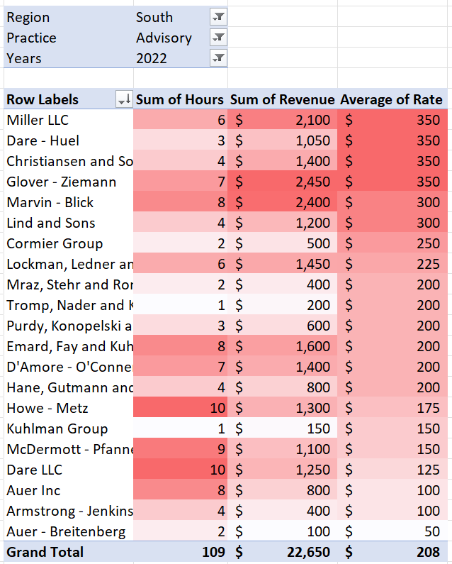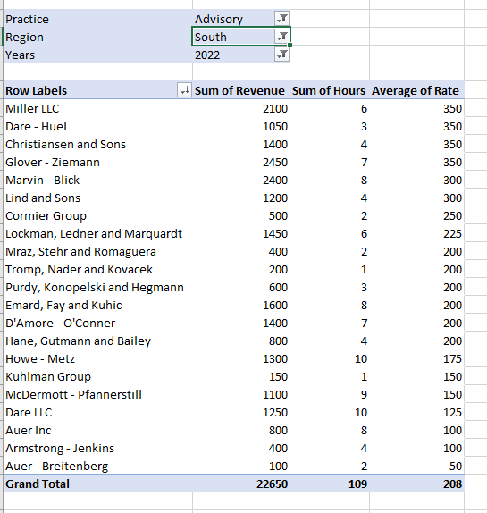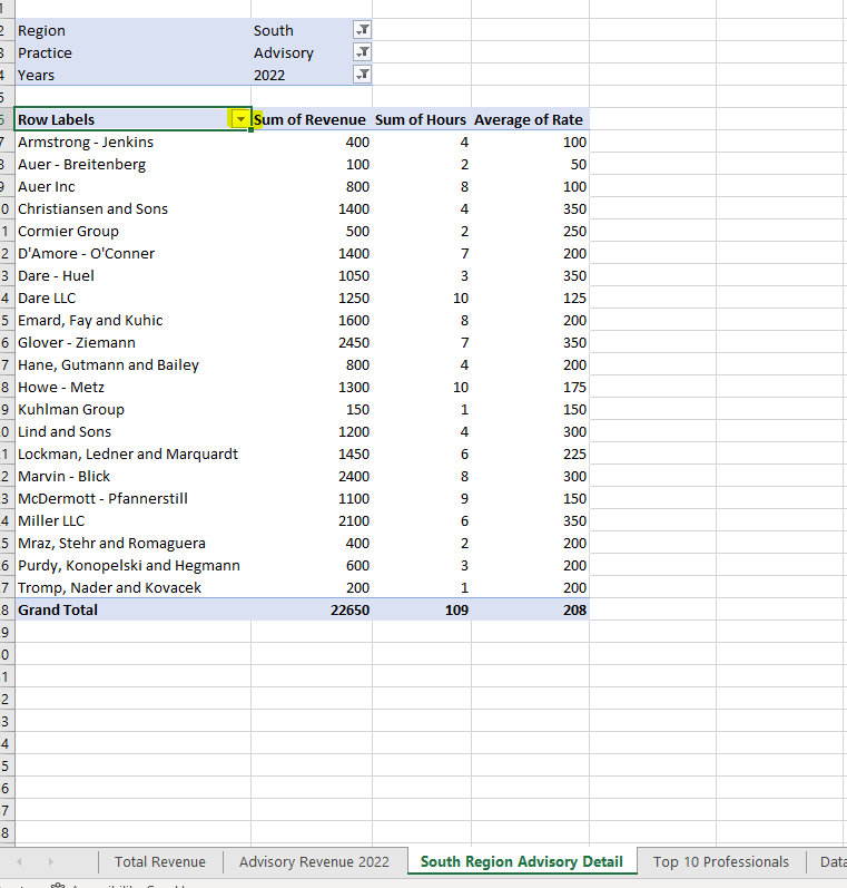 Third, create a pivot table containing the total revenue, total hours, and average rate billed per hour for each client serviced by the South region Advisory practice in 2022. Sort the table to show clients billed the highest average rate in descending order. The pivot table should be in a new sheet called “South region advisory detail”.