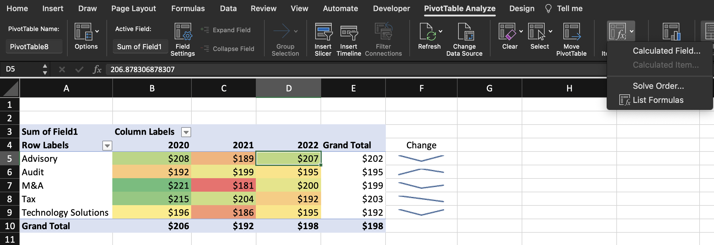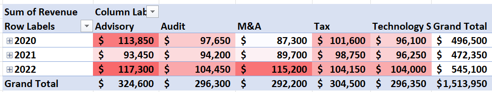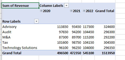 Second, create a pivot table displaying the total revenue for each region for the advisory practice in 2022. Sort the table by total revenue largest to smallest. The pivot table should be in a new sheet called “Advisory Revenue 2022”.