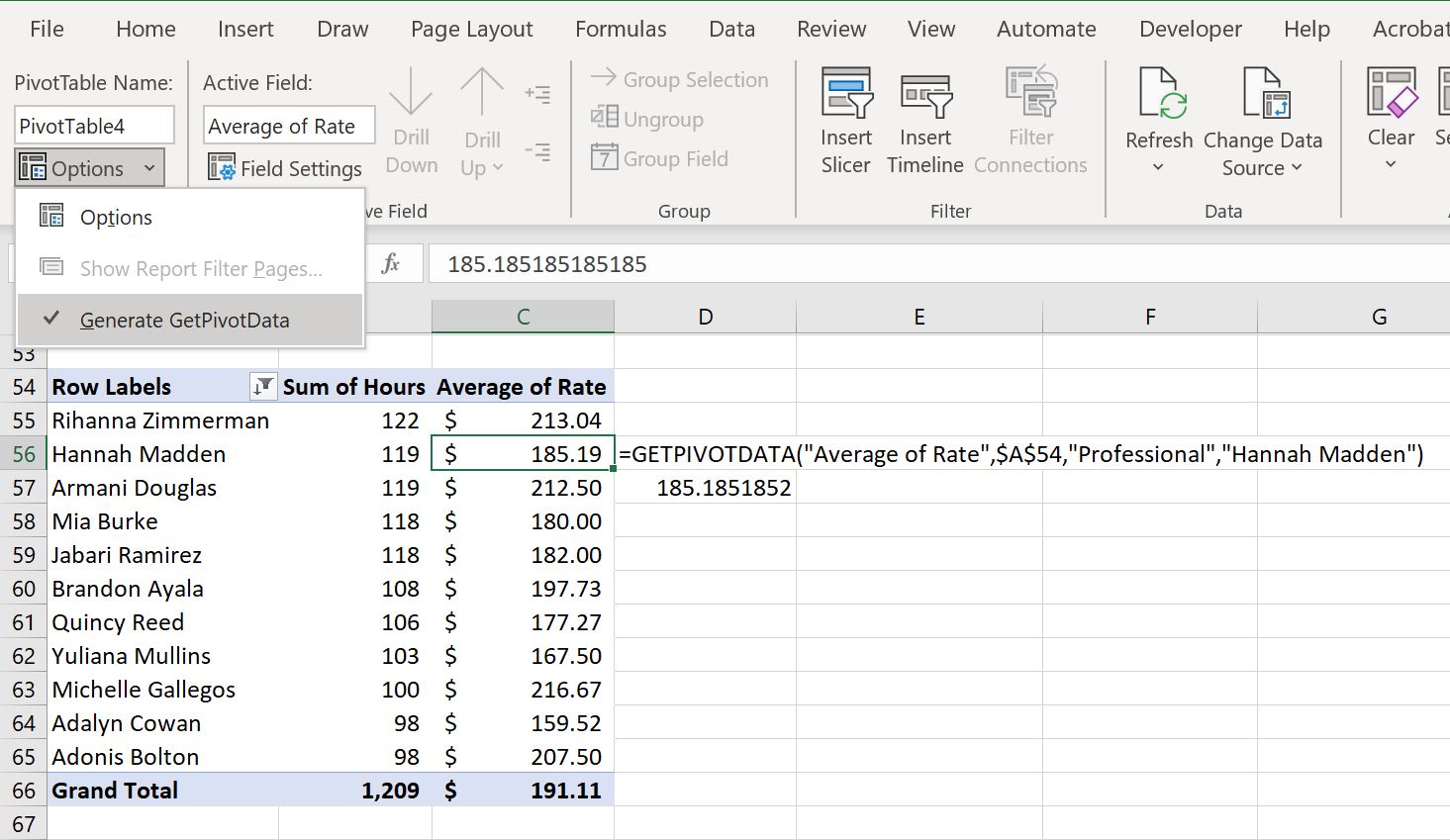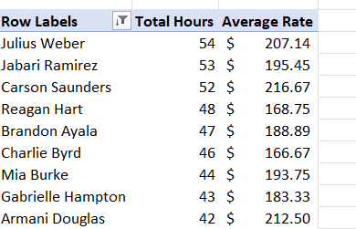 To filter the top 10 professionals by their hours, click the dropdown labeled “Row Labels” at the top of your pivot table, select “Value filters”, then select “Top 10”.