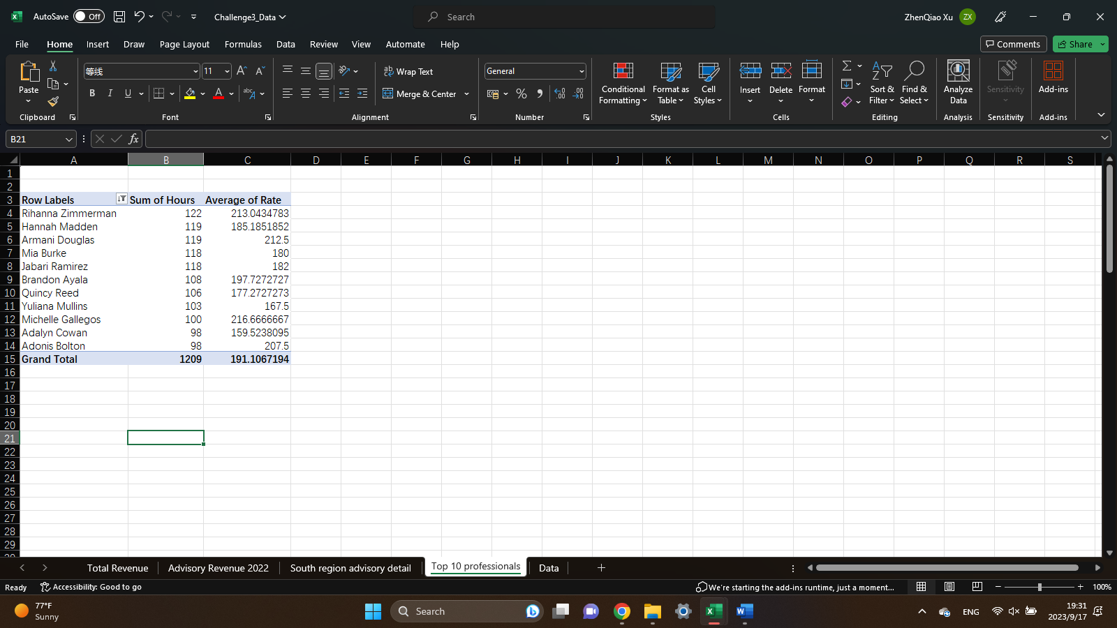 Fourth, create a pivot table displaying the top 10 professionals who billed the most hours in 2022, the total hours they worked and the average rate they billed. Sort by total hours works from largest to smallest. Format the table, so average rate is rounded to the nearest cent. The pivot table should be in a new sheet called “Top 10 professionals”.