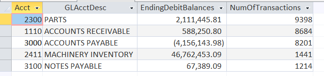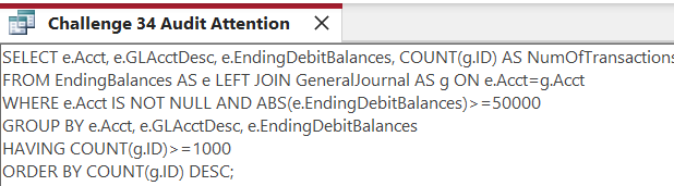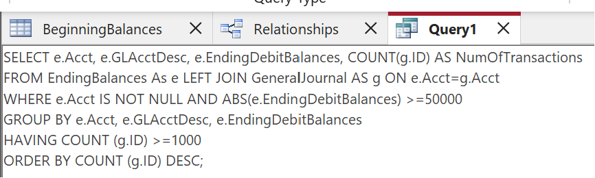 SELECT e Acct, e GLAcctDesc, e EndingDebitBalances, COUNT(g ID) AS NumOfTransactions FROM EndingBalances AS e LEFT JOIN Generallournal AS g ONe Acct=g Acct WHERE e AcctIS NOT NULL AND ABS(e EndingDebitBalances) > = 50000 GROUP BY e Acct, e GLAcctDese, e EndingDebitBalances HAVING COUNT(g.ID) » = 1000 ORDER BY COUNTIg.ID) DESC
