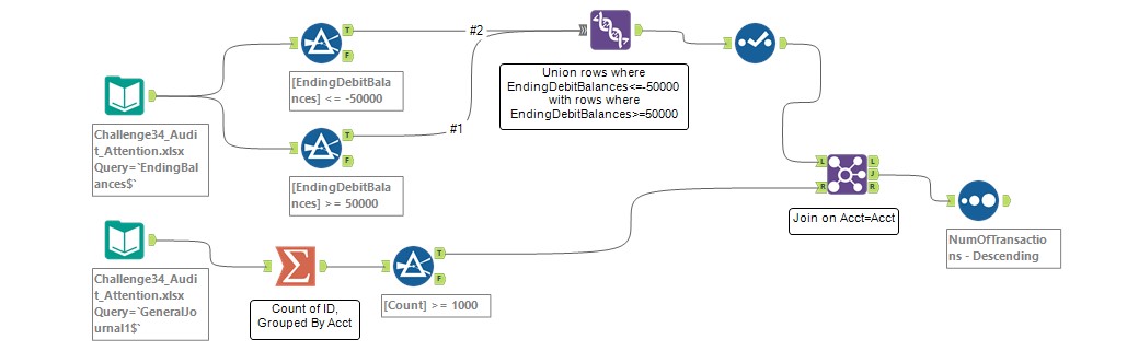 When trying to find the accounts that follow the criteria of having an ending debit or credit balance of $50,000 or more, remember that we are given the ending debit balance. I wrote an absolute value in my code to find the accounts with an ending credit balance of $50,000 or more because they will be written as negative numbers in our data.