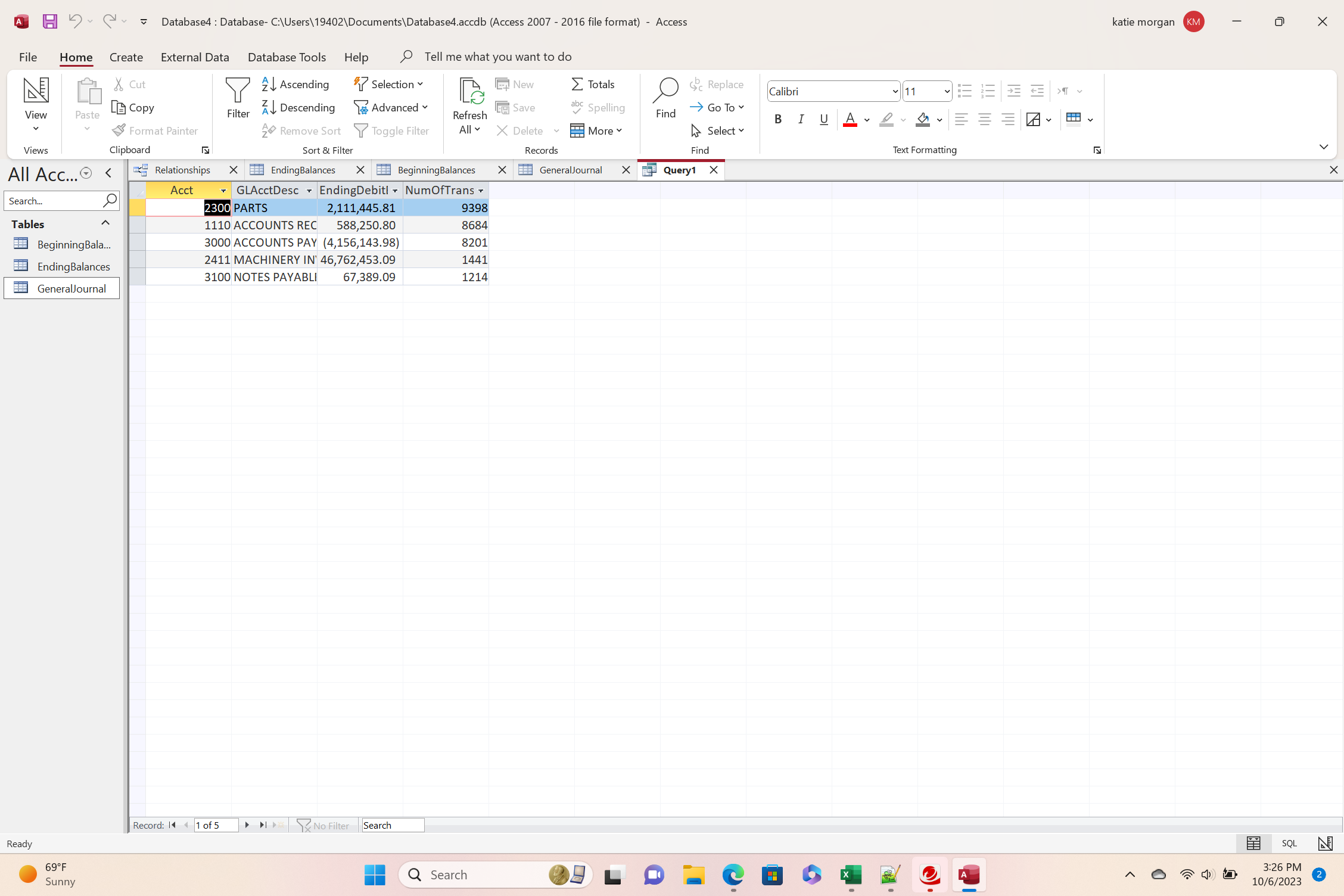 Third, write the SQL code to identify which accounts meet the aforementioned criteria. Remember, accounts must have 1,000 transactions or more and have an ending debit or credit balance of 50,000 or more. Sort by the number of transactions in descending order and be sure to sort out the data that has a null account number. After running your SQL code, the table you return should have the following columns: Acct, GLAcctDesc, EndingDebitBalances, NumOfTransactions.