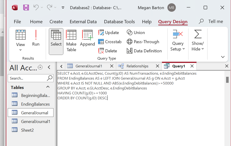 FROM EndingBalances as e LEFT JOIN GeneralJournal AS g ON e.Acct=g.Acct