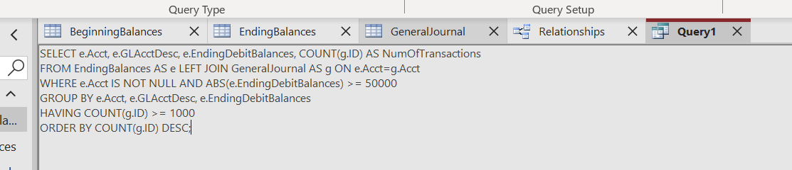 WHERE e.Acct IS NOT NULL AND ABS(EndingDebitBalances) > 50000