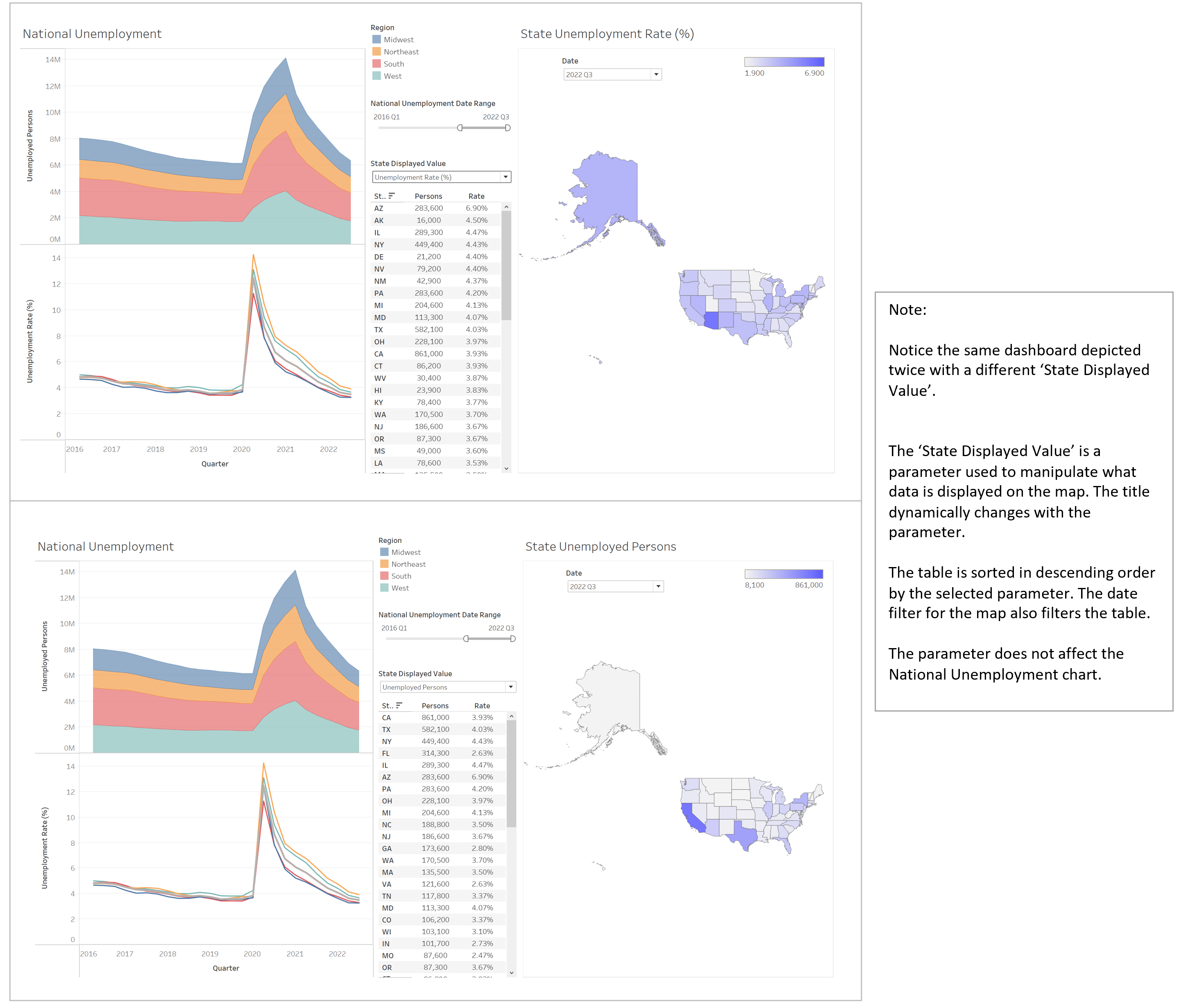 - Use the field ‘Parameter Value’ as the measure in the map chart and include it in the detail of the state unemployment table, so it can be used to sort the table. Now, whatever value is selected within the parameter will be the measure displayed on the map.