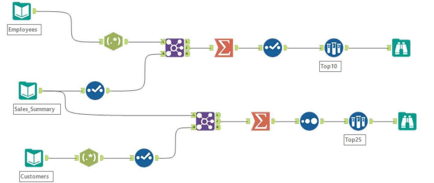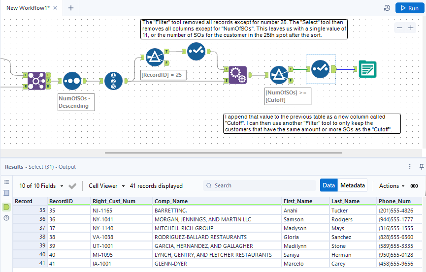 My workflow looked very similar to the solution. I never used the Select Records tool to get just the top number of records which was a quick solution. If I was to do it over again and to ensure there isn’t a tie between the 25th and 26th record I may use a formula to assign ranks and filter that way instead. Great challenge!