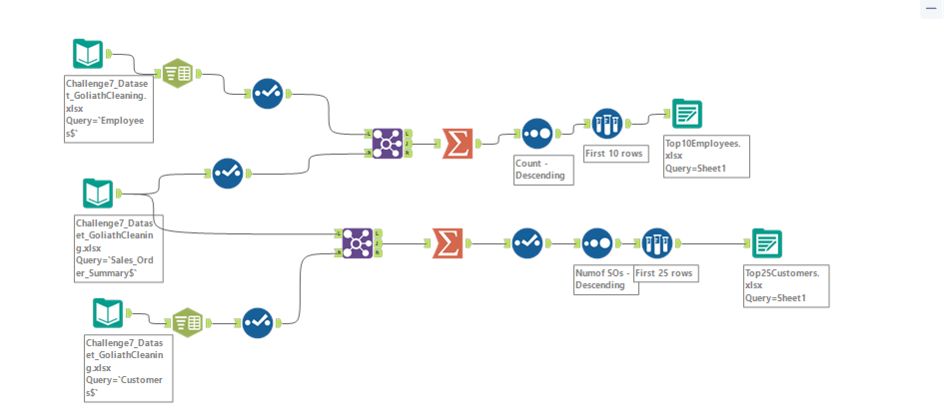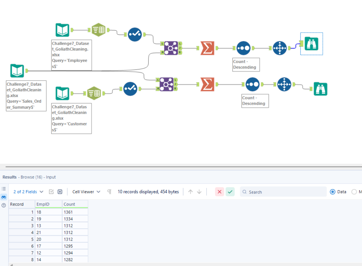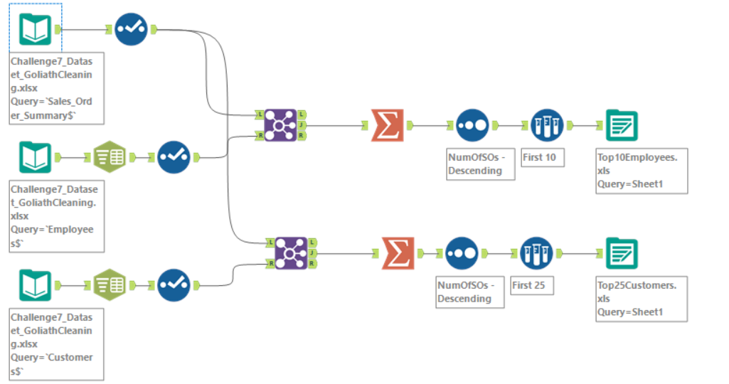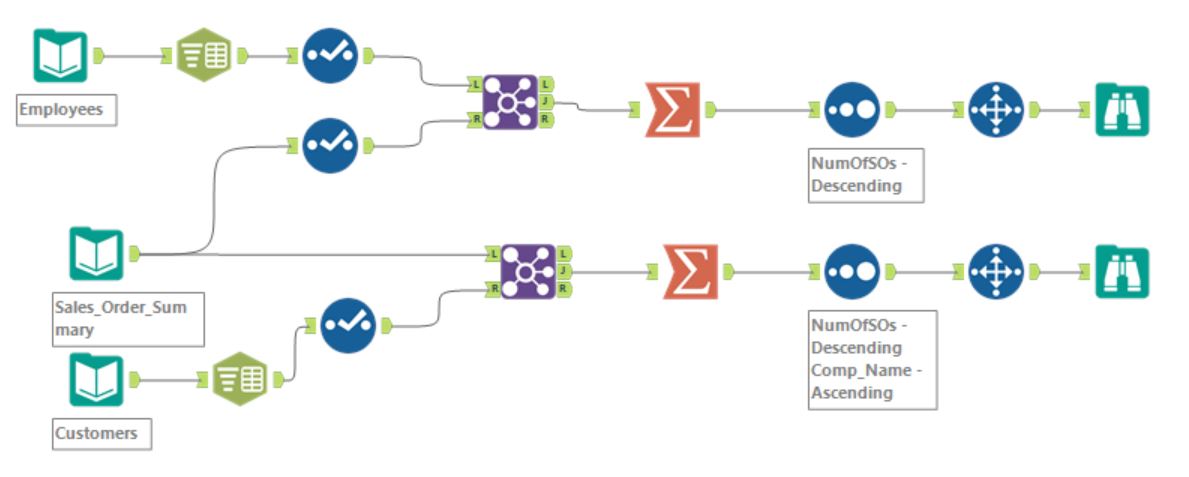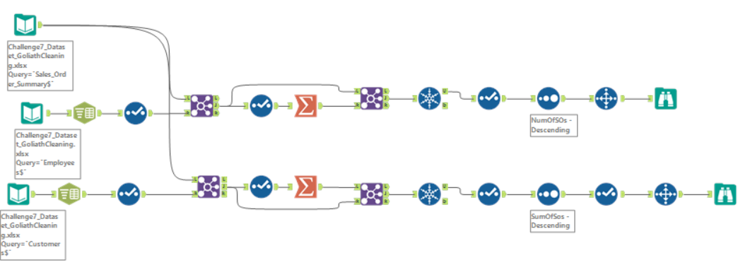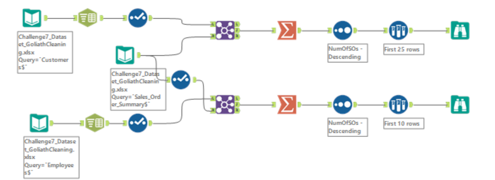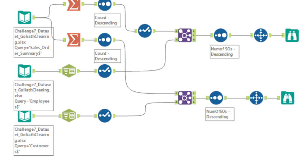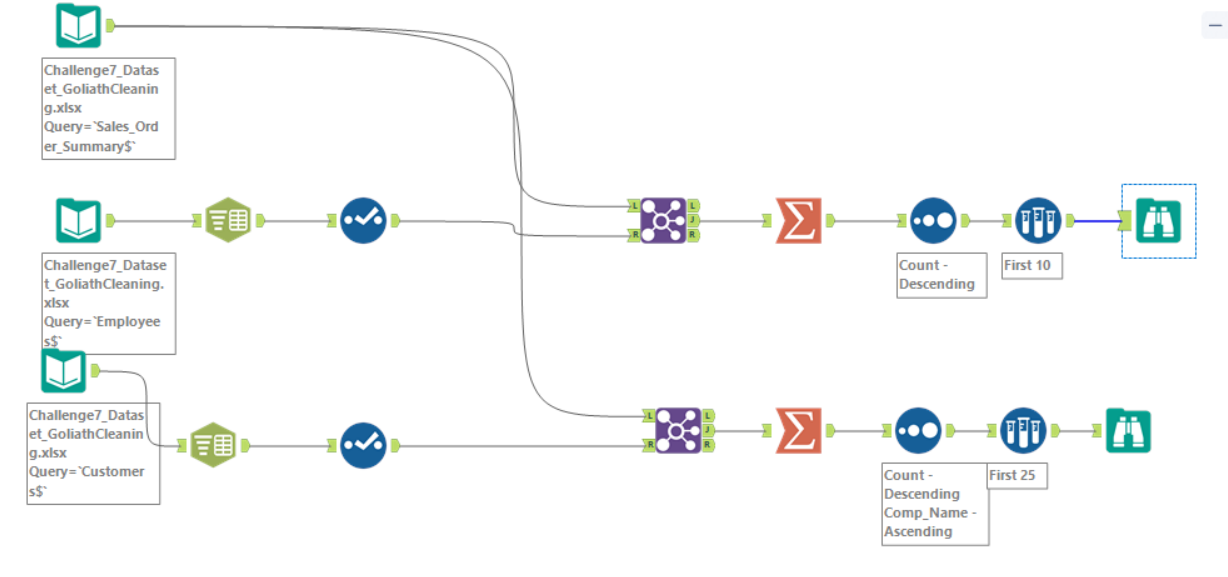 Great Challenge! I didn’t use the sort method before I joined, because I figured it would all be filtered through later during the summarize tab when I made the two tables. But other than that my solution looks basically the same!