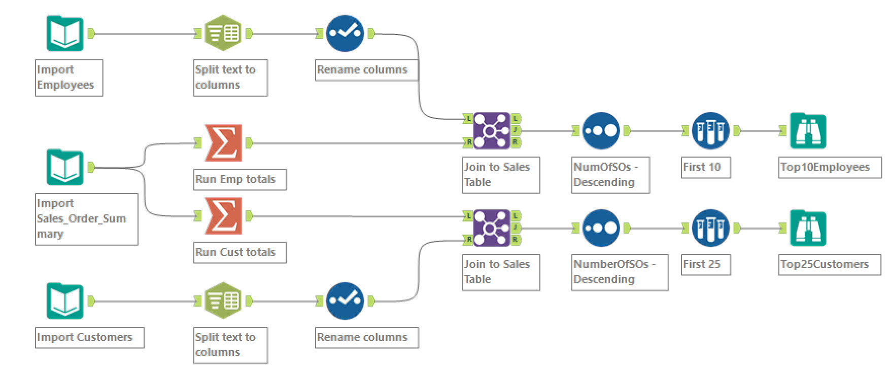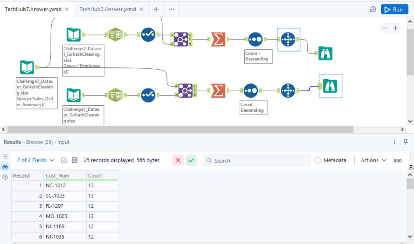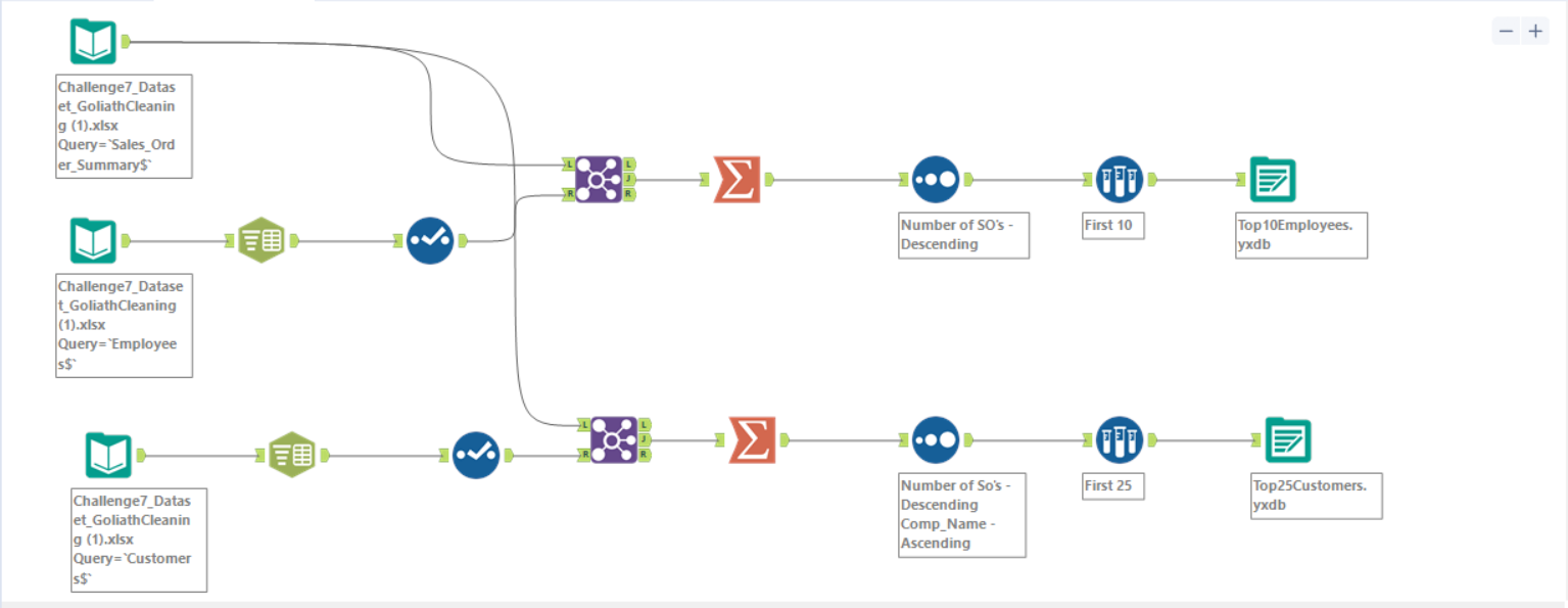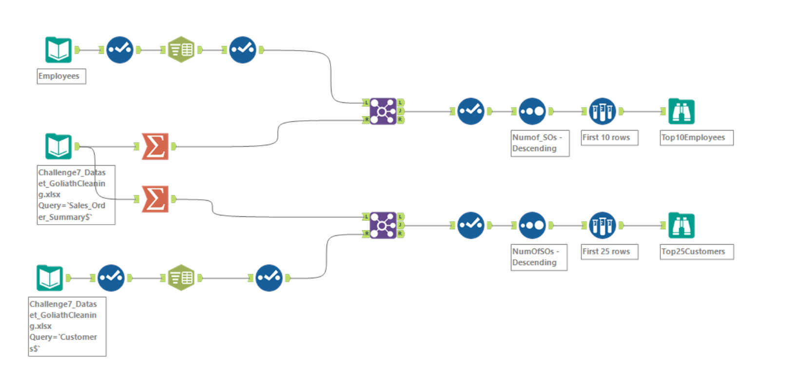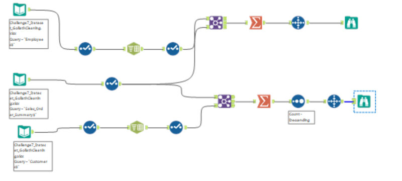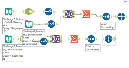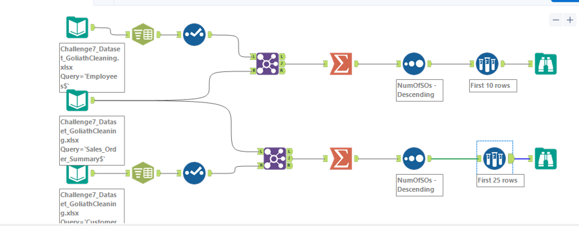 Great Challenge! I didn’t use the sort method before I joined, because I figured it would all be filtered through later during the summarize tab when I made the two tables. But other than that my solution looks basically the same!
