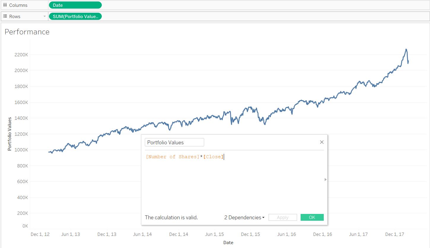 - Create a calculated field that represents the portfolio value of the security on a particular day. Formula: [Number of Shares]*[Close]