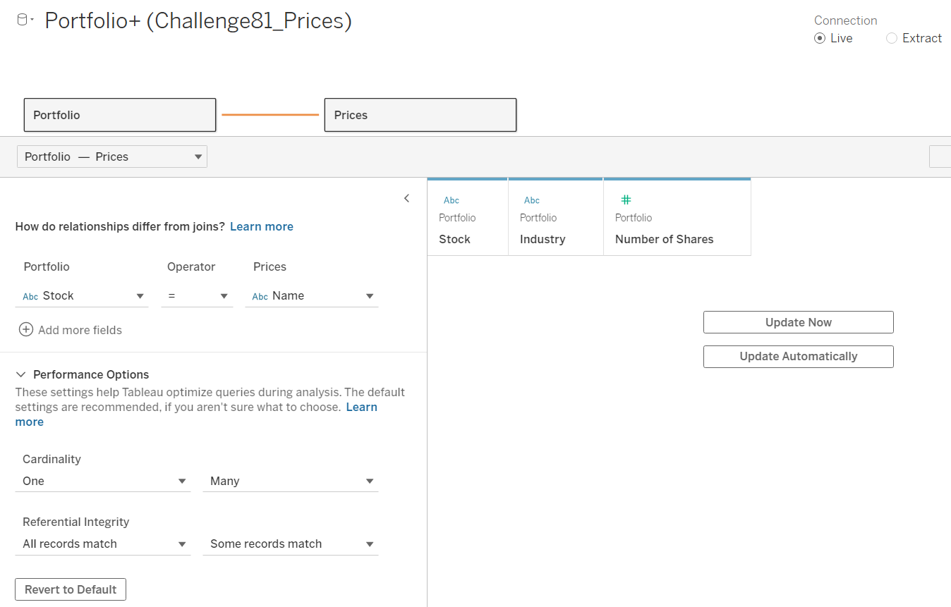- The parameters for the data set relationship is: Portfolio (Stock) = Prices (Name). The cardinality is Portfolio (one) – Prices (many). The referential integrity is Portfolio (all records match) – Prices (some records match).