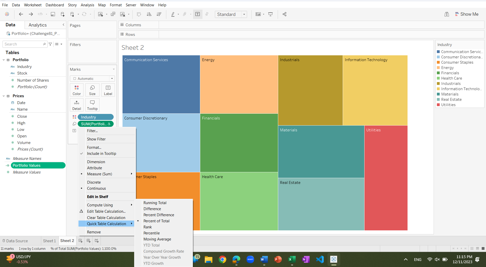 - To find the percentage of the total portfolio value, use a quick table calculation on the SUM(Portfolio Value) pill. The quick table calculation should be “% of Total.”