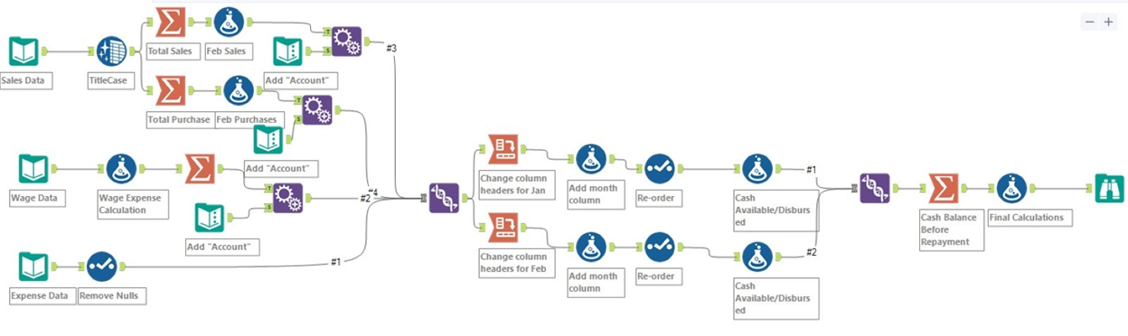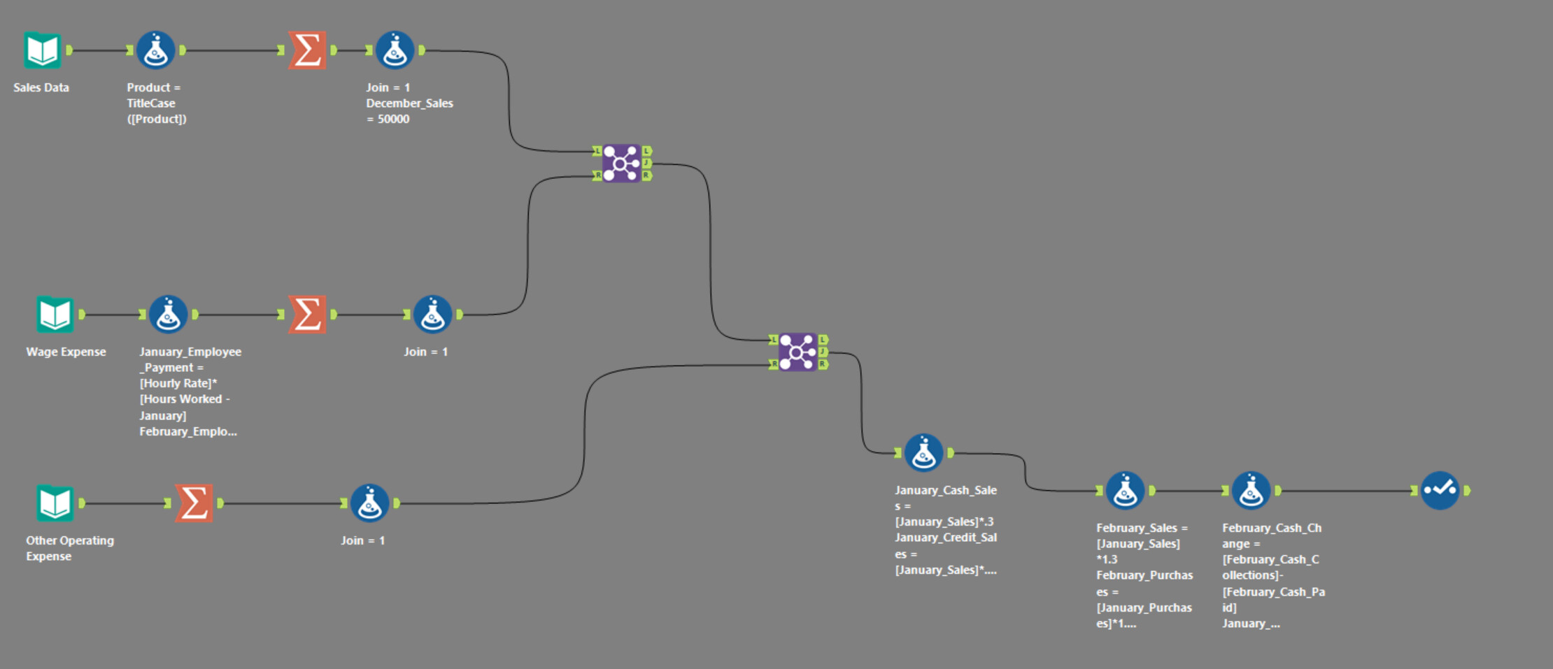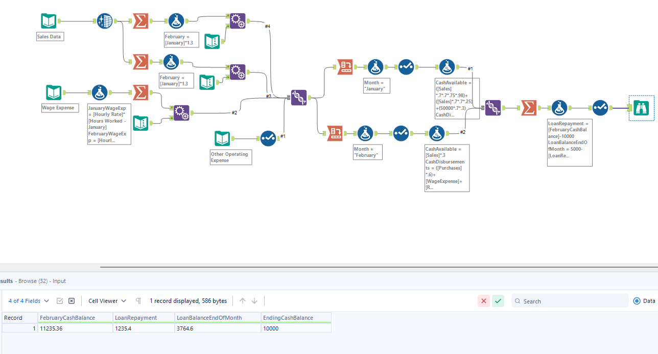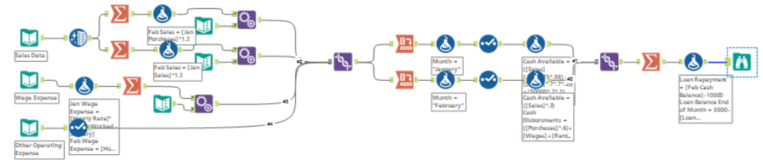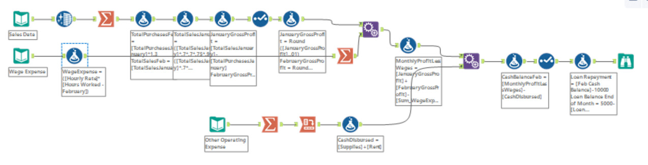 Upload the data into Alteryx. Clean the sales and purchases data so that the Product column is in title case and find the total amount of sales and purchases for both January and February. Calculate the wage expense for both January and February. Get all of the data (Sales, Purchases, Wage Expense and Other Expenses) into one table. Output to a browse tool with the following headers: Feb Cash Balance, Loan Repayment, Loan Balance End of Month, Ending Cash Balance. Good luck!
