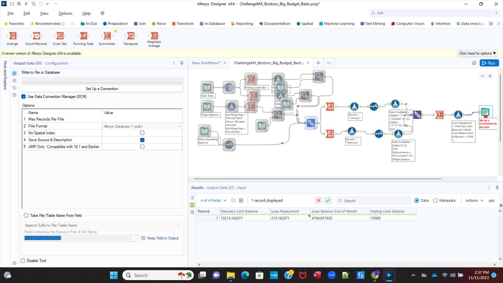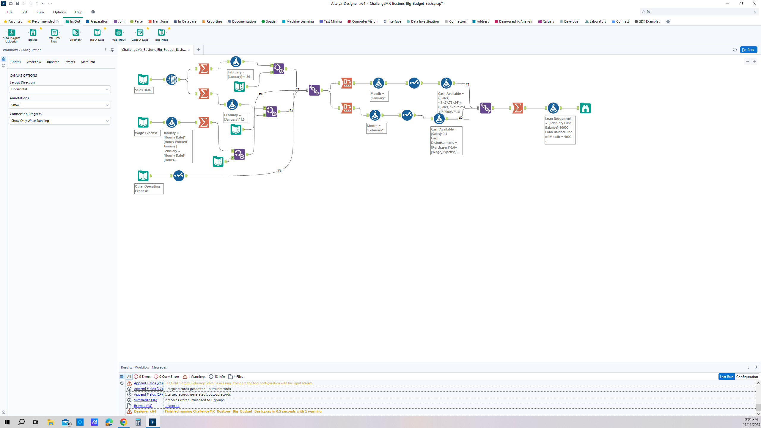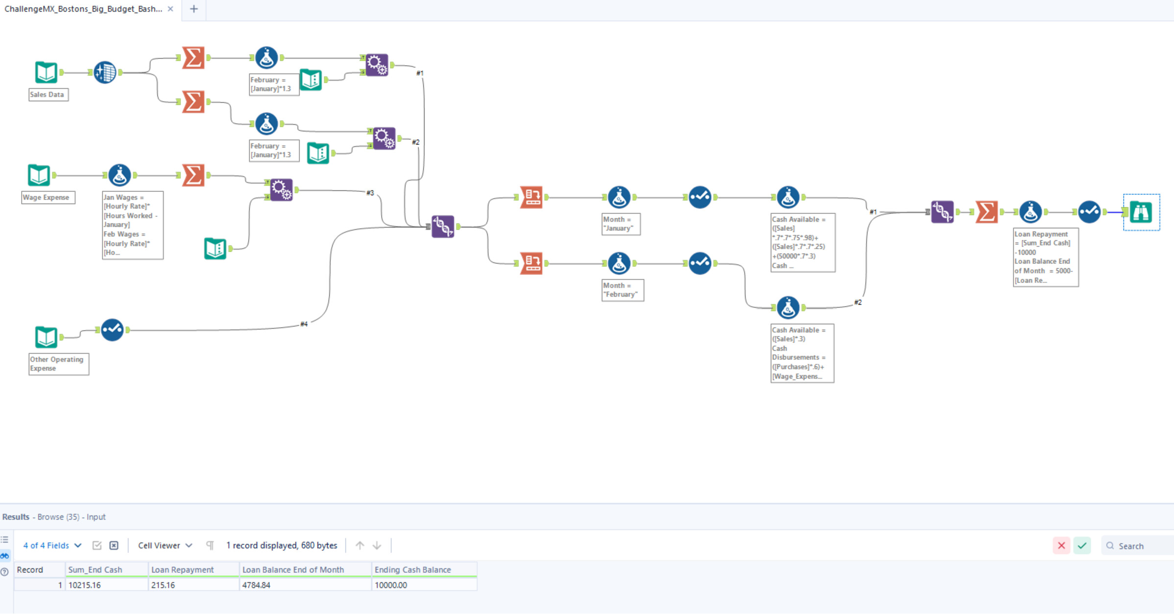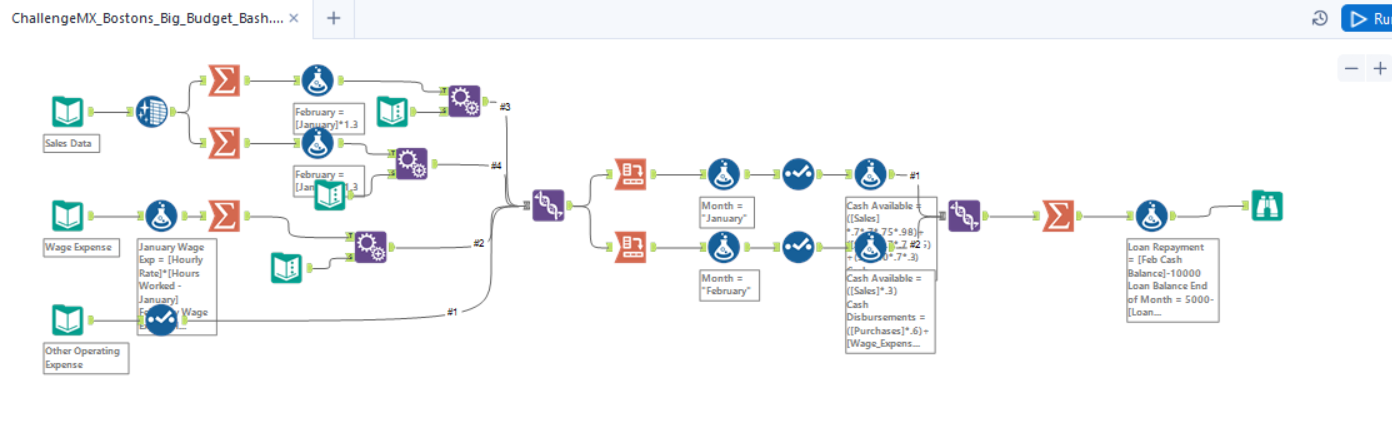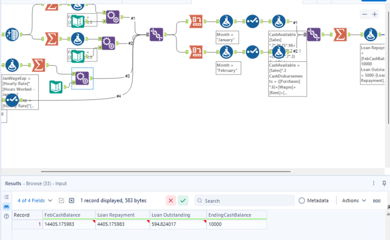 I did the first part of the work flow the same until I got to the append fields section. The video was helpful in helping me understand how to use that tool. Overall, a good challenge, but I’m not sure that the formulas for calculating the total cash used for the month are correct or fully match the instructions given for the challenge. At first, I got significantly different cash flows. For example, 30% of the sales weren’t on credit (cash sales), but the video instruction never accounted for that cash. Additionally, the instructions say 60% of purchases are paid for in the month they are incurred, but it looks like the video instruction reversed that and had us apply the 60% in February. Perhaps I didn’t fully understand the instructions, but it might be helpful to clarify more in the instructions. I ended up having to go and watch the step-by-step instructions in the video. Overall, really good practice, but it may be helpful for future students to clarify some of the calculations. Thanks so much for putting this challenge together!
