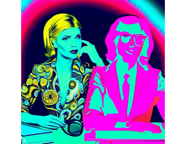 “boss accounting woman in psychedelic and andy warhol” using Microsoft Bing image creator.