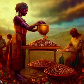I generated this image using Microsoft Image Creator (which, while powered by DALLE 2 was giving me much better images than DALLE 2 was) with the prompt " Create a landscape composed primarily of dried beans. In the foreground, a woman measures beans with a set of golden scales. The beans being measured are paid to laborers working the beans. Digital Art"